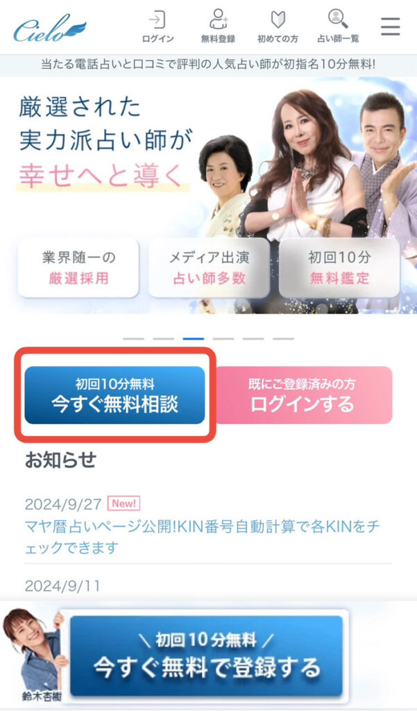 シエロの初回特典は他にはない魅力が盛りだくさん。初回鑑定10分無料で7人まで無料で相談することができます。