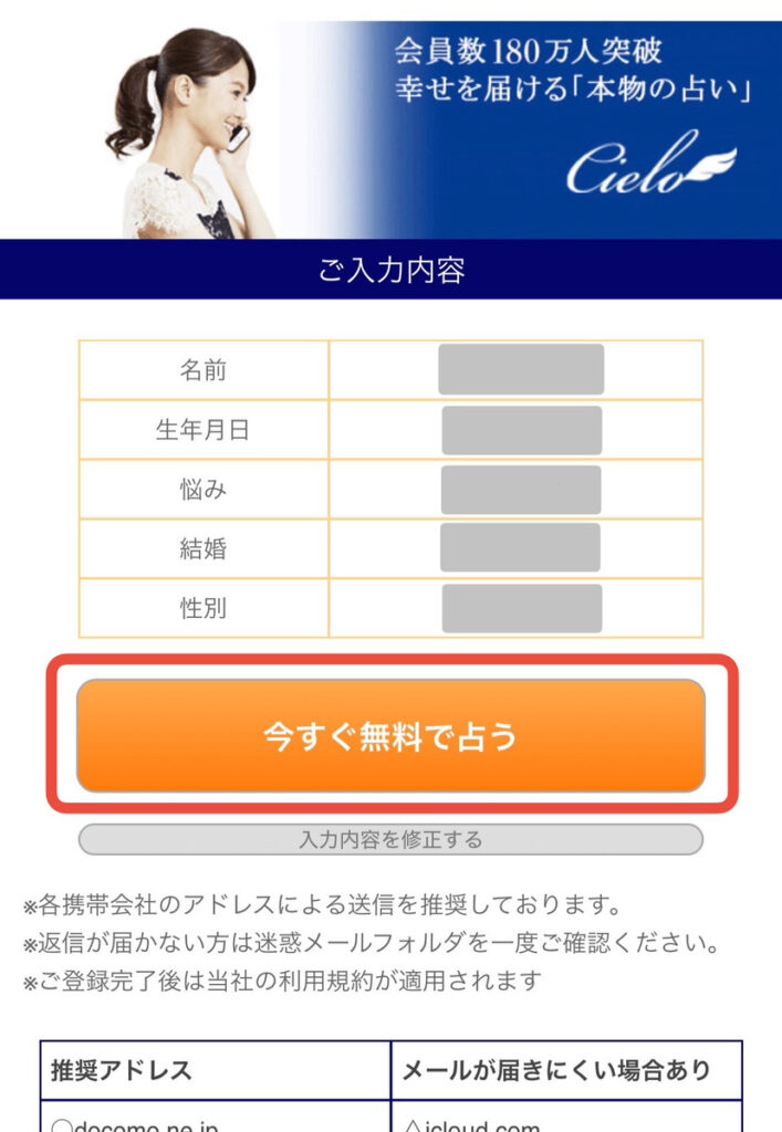 「今すぐ無料で占う」をタップするとメーラーが開き、空メール送信ができます。