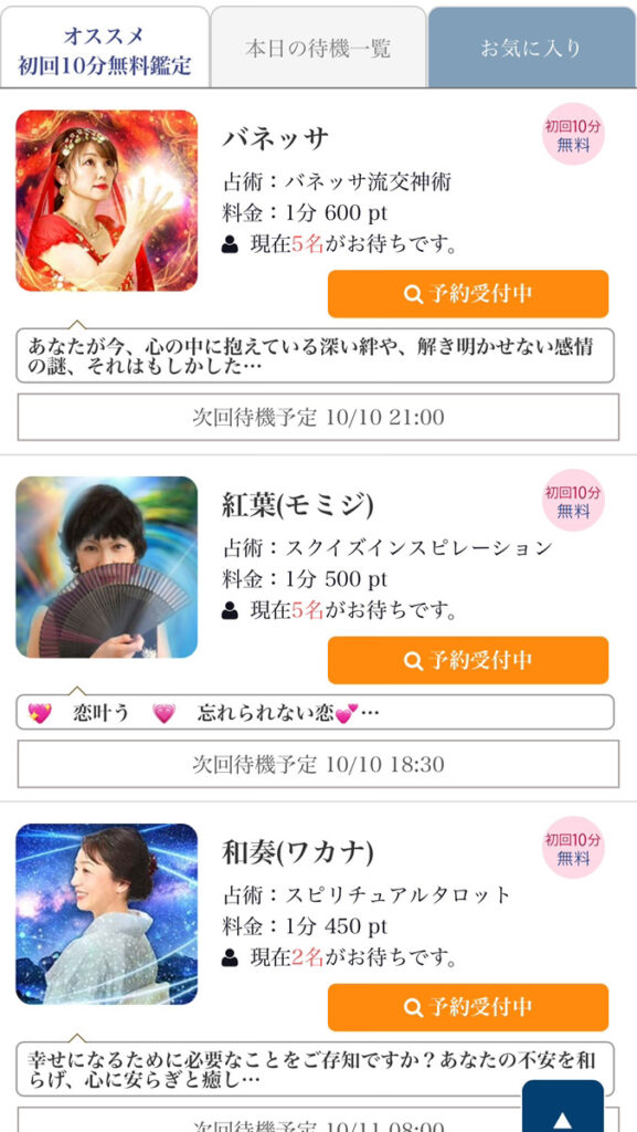 一覧ページから希望の占い師を選びます。