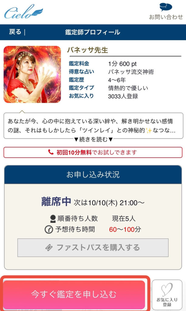 相談したい占い師が「鑑定中」や「待機時間外」のとき、その占い師を選択すると、鑑定予約の申し込みができます。